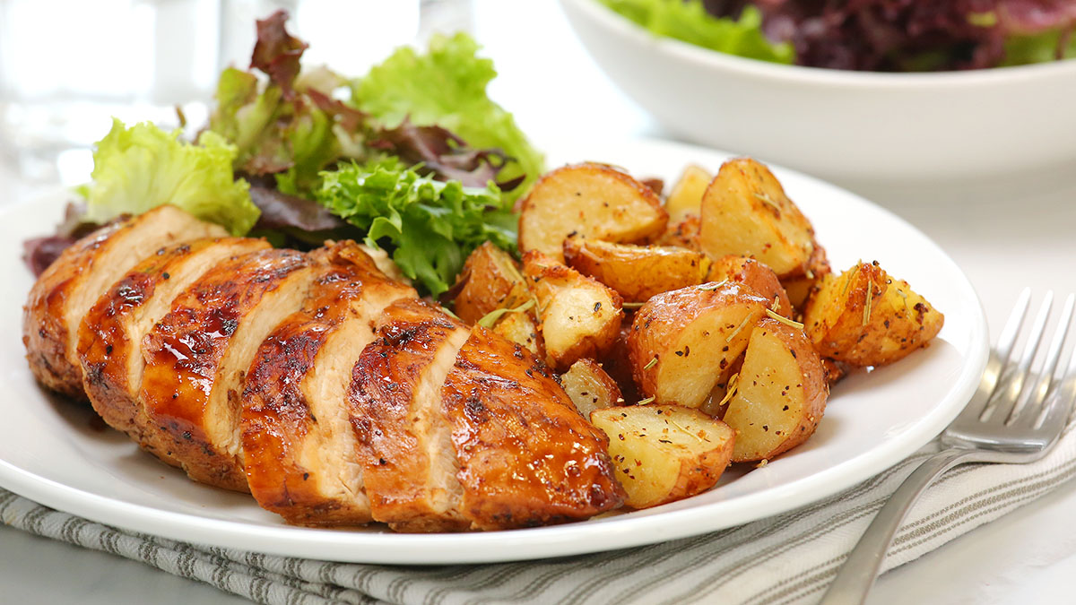 - Carne de pui, snitel, cartofi la cuptor cu rozmarin si salata.