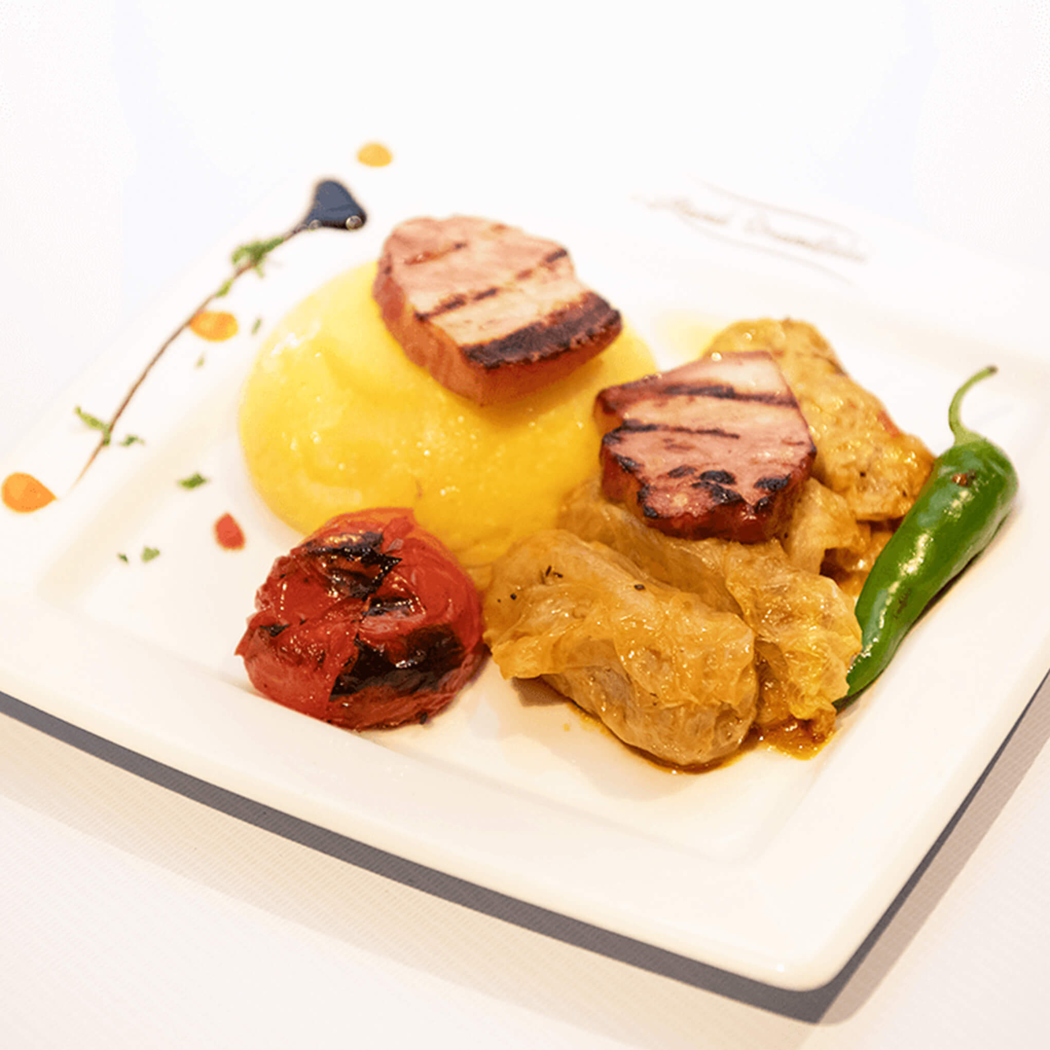 - Sarmale in foi de varza cu mamaliga, adrei iute, smantana si crispy bacon.